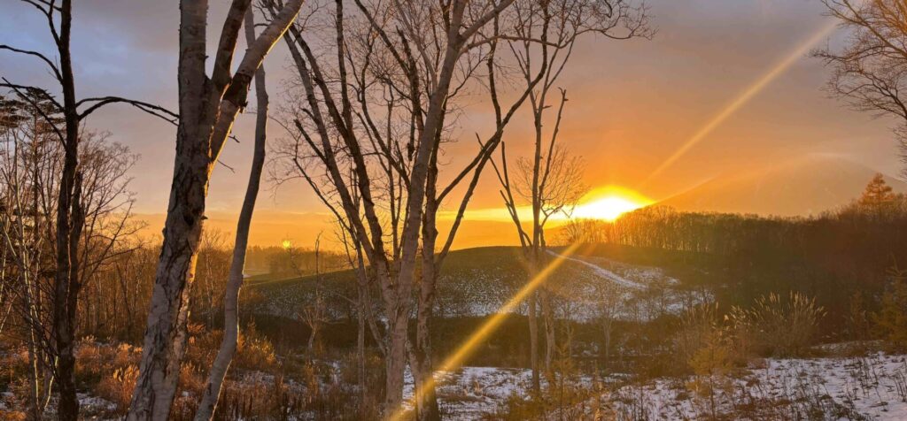 温泉宿からの山際の日の出🌅(とても美しいんですが、熊がいないか気になってしまう…🐻)