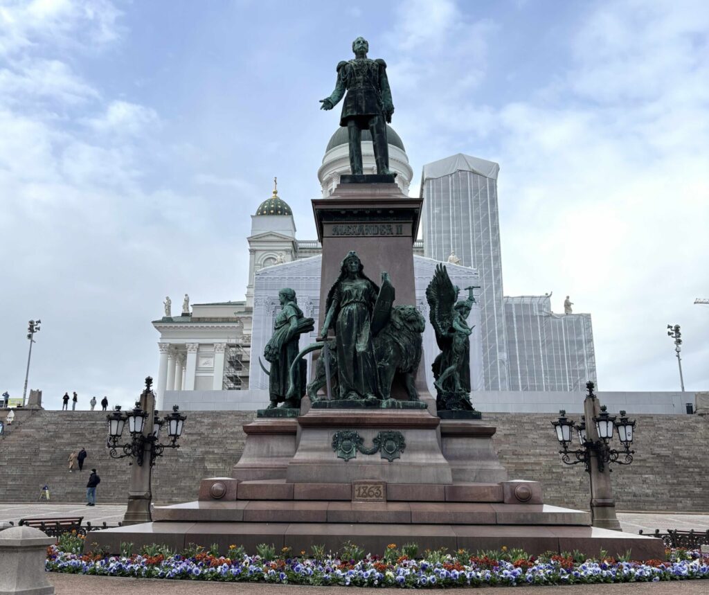 ヘルシンキ大聖堂の前の銅像(大聖堂は工事中でシートに覆われてました)