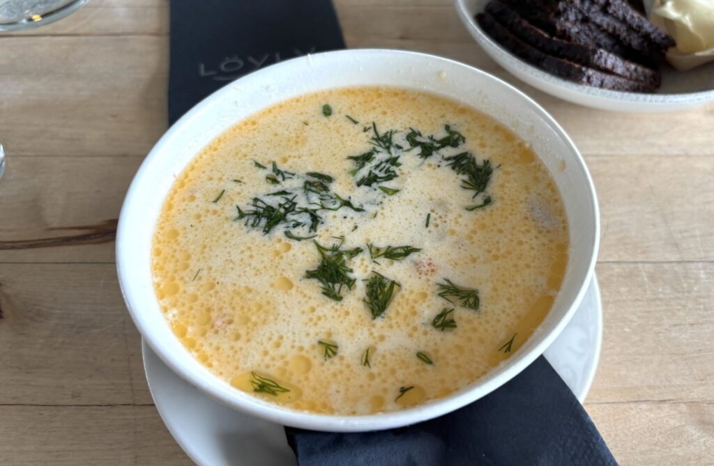ロウリュのレストランで食べたサーモンスープと黒いパン