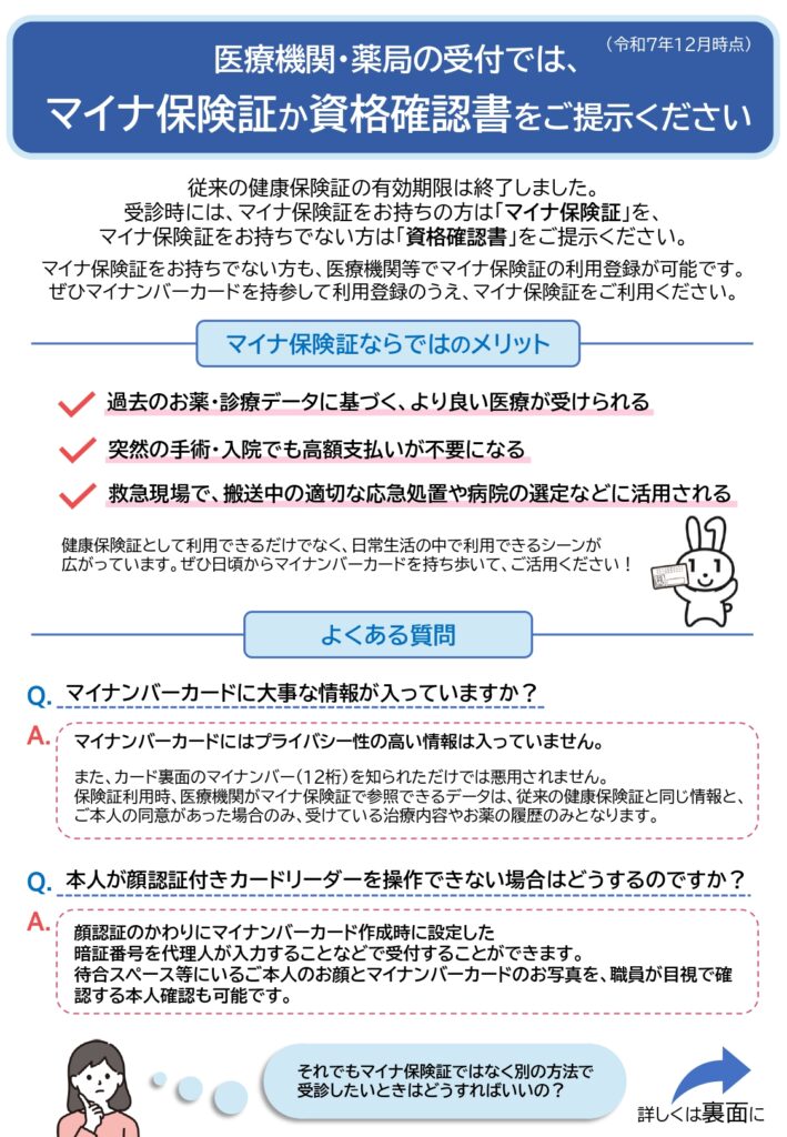 システムトラブルやデータ未連携時に備え、各種医療証(こども医療、難病、障害者医療など)も一緒にお持ちいただくことを強く推奨します。